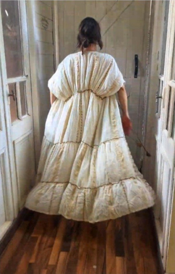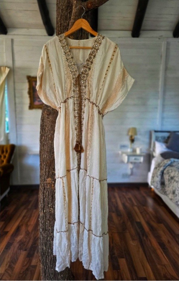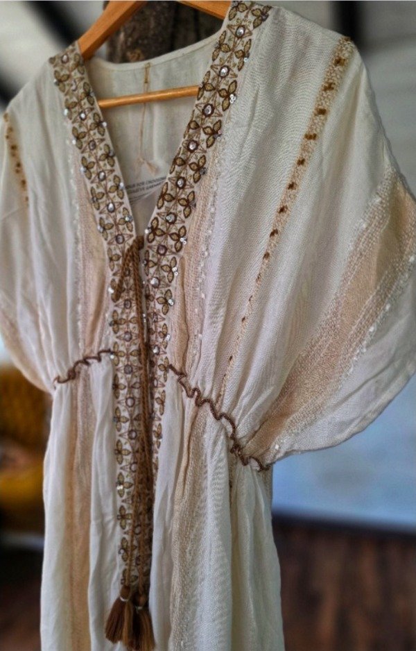 De gasa liviana con bordados en hilo dorado y detalles de pasamanería, se ajusta en la cintura con un lazo de pompones para darle forma o se puede usar abierto para un look relajado.