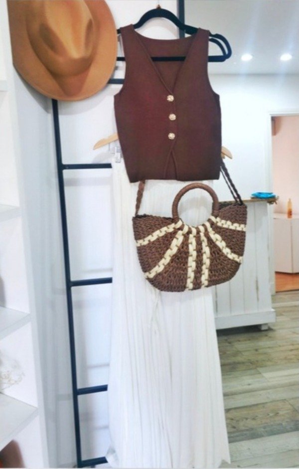 Cartera tejida artesanal en fibras naturales, con diseño trenzado bicolor que combina el tono cacao con detalles en crudo. Su estructura firme y liviana la hace ideal para acompañar looks de verano o media estación, aportando un aire bohemio y natural.